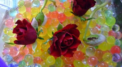 Аквагель окрашен в различные цвета, что позволяет создавать, различные красочные композиции в прозрачных вазах. Шарики имеют крошечные отверстия (невидимые невооружённым глазом), которые удерживают воздух и капельки воды.